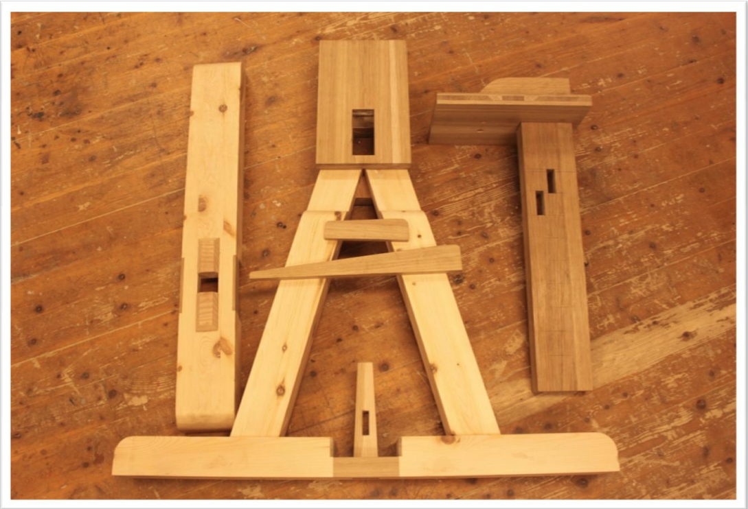Bukken er laget av furu som er forsterket med eik på kritiske punkter. Selve klemma er laget av eik og platene i klemma er krysslimt (3 lag) eik. Foten er låst ved hjelp av en tapp med kile i midten. Med to slike bukker og løse langbord er det snart å sette opp en skottbenk der det trengs. Langbord kan en improvisere med 2″ x 8″ som er en vanlig dimensjon hos trelasthandleren.