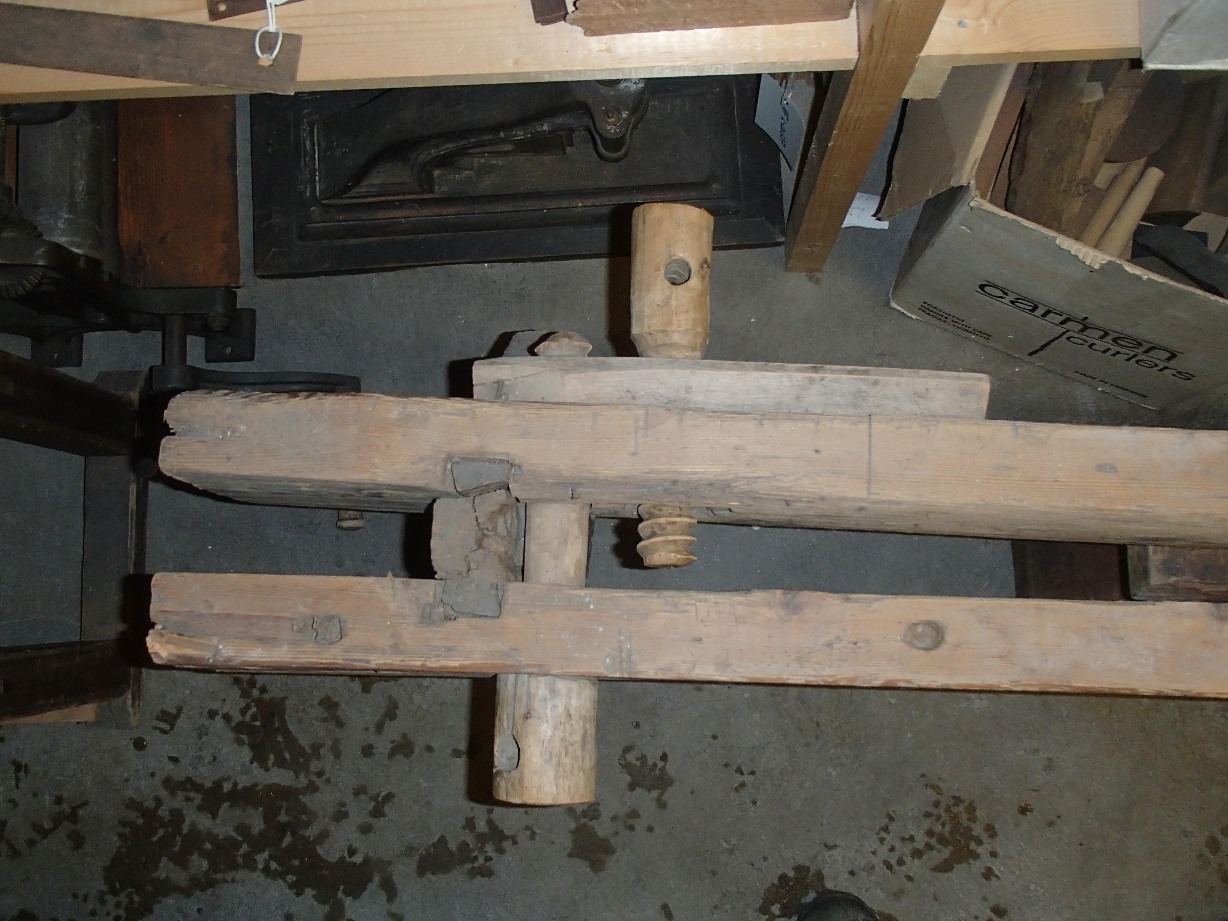 Benet har sprukket i enden og benken holdes sammen med en skrue. Skruen øverst brukes til å feste bordet som skal skytes i rettbenken. Foto NF.