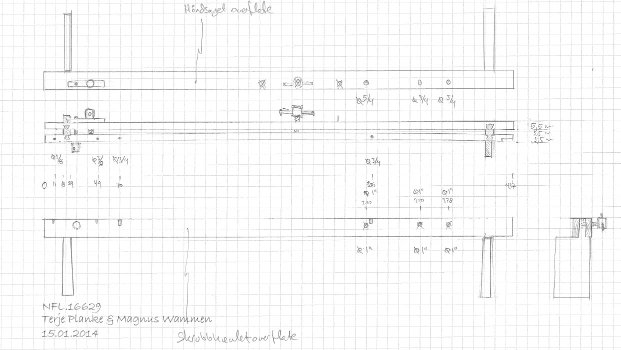 Materialer: Retteplankene og bena er i furu. Margen er lagt in på retteplankene. Plankene er håndsagde, noe som synes på ene yttersiden (baksiden på tegningen). Den ene yttersiden (framsiden på tegningen) ser vi er primært skrubbhøvlet og litt sletthøvlet.
