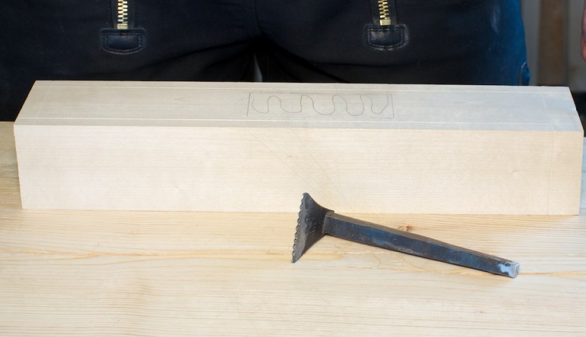 Arbeidet med å hogge ut sponrom og kilegang gjer eg på høvelbenken min som er kopi av høvelbenken frå Eggagården på Røros. Den har ikkje baktang. I staden har den ein benkehake som har spisse tenner og som ein støytar emnet mot for å halde det på plass under arbeidet. Benkehaken er smidd av den svenske smeden Bertil Parmsten. Foto: Roald Renmælmo