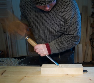 Eg hogger meg gradvis bakover og prøvar så tidleg som mogleg å lage ei referanseflate som har 45 graders vinkel for det som blir senga for høveltanna. Foto: Roald Renmælmo