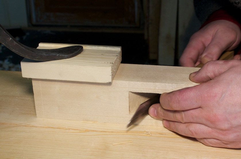 Eg startar med å sage ut framkanten av kilegangen. I bakkant følgjer eg kanten av sponåpningen og i framkant styrer eg etter streken og støttar saga med fingertuppen under saging. Foto: Roald Renmælmo