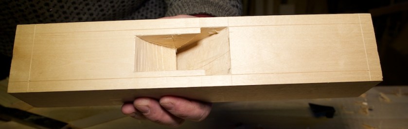 Framkanten av sponrommet er runda nedover. Grovarbeidet kan gjerast ved å hogge ut med ein vanleg hoggjarn. Siste finpuss kan vere praktisk å gjere med eit stemjarn med butt sliping (gjerne 50 grader) eller konveks slipfas og arbeide med fasen ned. Foto: Roald Renmælmo