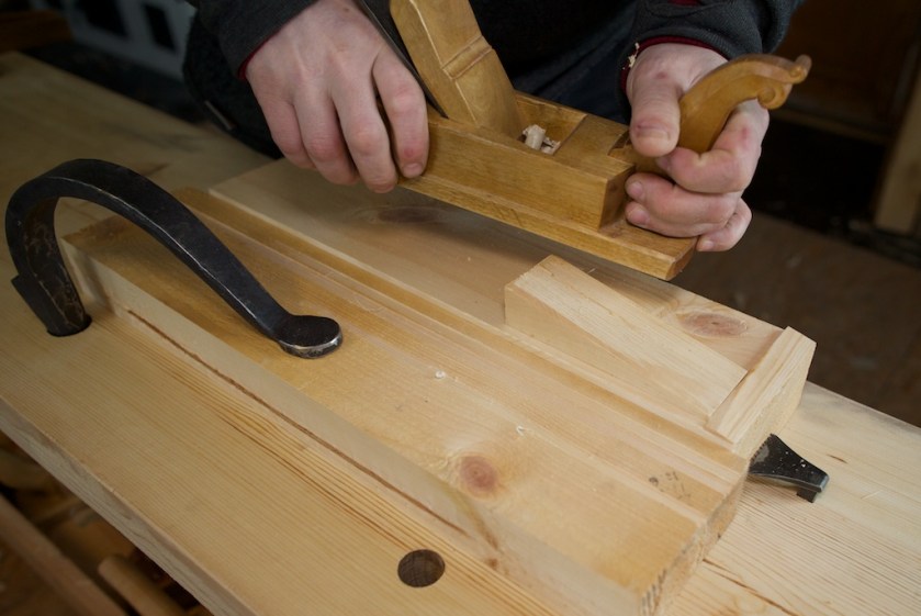 Previous Image Next Image Høvling Det kan vere tungvindt å høvle til ein slik kile. Eg har laga meg til ein kloss som er 2 ½» tjukk og med ei tynn list limt på som høvelstopp i framkant. Foto: Roald Renmælmo Del dette: Click to email a link to a friend (Opens in new window) e-post Klikk for å skrive ut (Opens in new window) Skriv ut TweetLik Lastar …