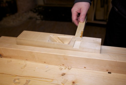 Når ein har målt rett, merka rett og saga rett så skal det bli rett, men det er greitt å prøve. Når eg saga slik at streken stod att i kanten av sagskåret vart det passe trongt. Foto: Roald Renmælmo