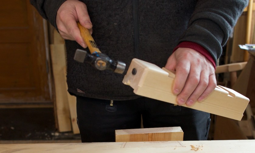 Eg slår inn slagknappen med hammar. Fordelen med ein slagknapp av jarn er at det er lettare å justere høveltanna med ein liten hammar og ein sparar slitasje på høvelstokken. Foto: Roald Renmælmo
