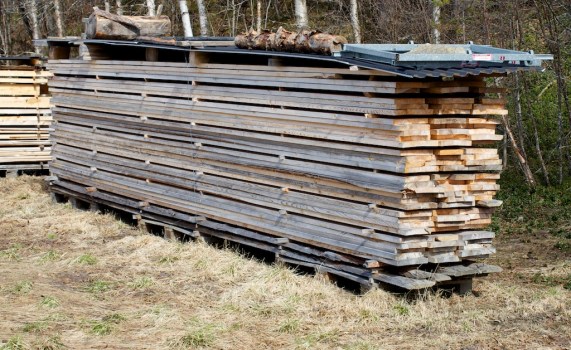 Material som er vértørka kan leggast saman utan strø om han ligg under tak, helst innomhus. Her er ein stabel som står utandørs men med solid overtekking. Materialen her har først lege ein vinter strølagt og så lege på denne måten ein vinter. Eg legg noko strø, for kvar 5-6. flo, for at stabelen skal bli meir stødig. Her er det lite luft under bordstabelen men nederst er det lagt to floer med gamal rivingsmaterial som vern for dei nedste borda. Foto: Roald Renmælmo