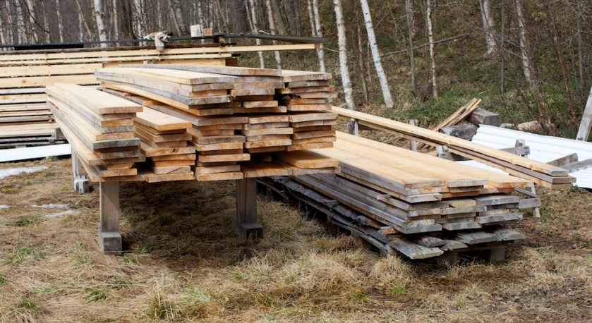 Eg sorterer ut bord som høver til golvbord. Dei ulike sorteringane er til golvbord, kledingsbord og takbord. Golvborda treng ikkje å ha særleg mykje alved så desse borda plukkar eg ut til dette. Foto: Roald Renmælmo