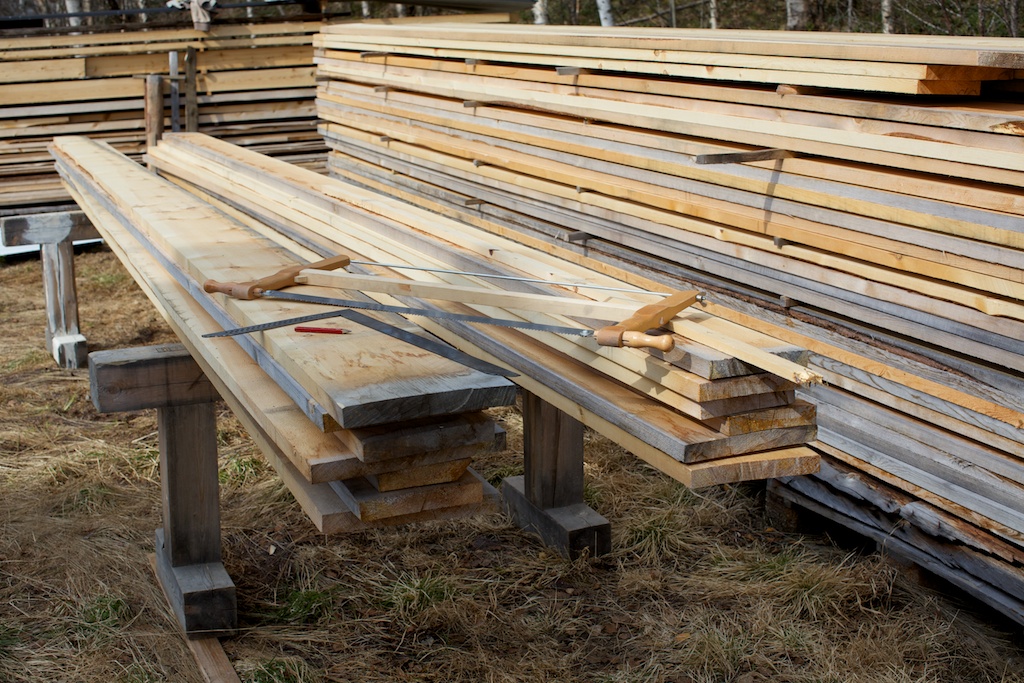 Ei spisstennt grindsag med grov tanning, 5 tpi, høver godt for grovkapping av slike bord. Ein boksvinkel er greitt å ha for å streke med. Målelekta ligg klar. Foto: Roald Renmælmo