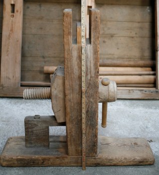 Bukken har den eine (høgre) foten fast og den andre laus. Høgda på bukken er 77 cm. Langbordet stikk omlag 3,5 cm over toppen av bukken. Total høgd vert då omlag 80 cm. Foto: Roald Renmælmo
