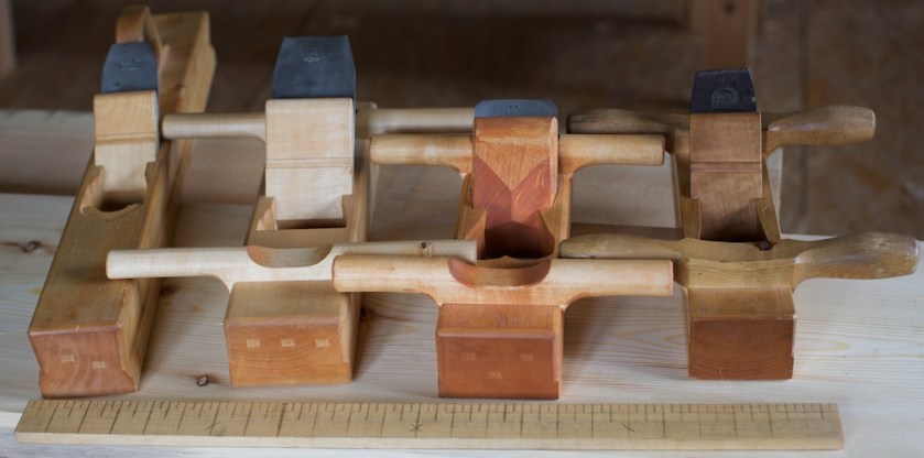 I prinsippet kan alle høvlar med plan sole nyttast til å høvle flask. Desse høvlane er kopiar av høvlar frå første halvdel av 1800-talet og er laga spesielt med tanke på å fungere saman i ein samanheng. Frå høgre, skrubboksen, ein kort slettokse, ein lang slettokse og langhøvelen. Foto: Roald Renmælmo
