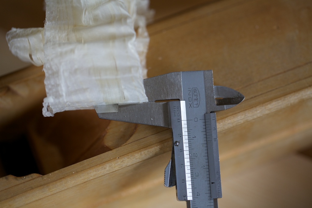 Langhøvelen kan stillast for å ta riktig tynne spon. Denne er ca 0,05 mm tjukk. På så fint stille kan ein få ei veldig glatt overflate men det tar lang tid å høvle. Foto: Roald Renmælmo