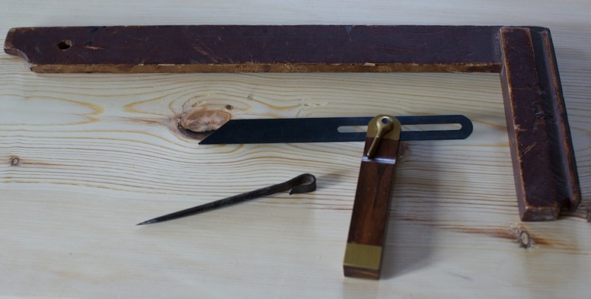 Den store bordvinkelen kan vere grei å ha når ein skal starte å merke dei første borda for kapping. Merking gjer ein med ei rissnål for å få nøyaktig strek. Ein svaivinkel er grei å ha for å overføre vinklane på borda med rot/topp avsmalning. Foto: Roald Renmælmo