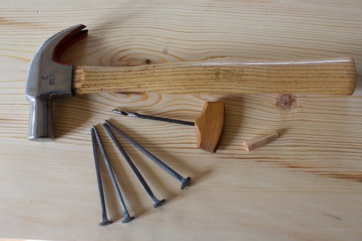 Ein god hammar som du er venn med er viktig. Å bomme på spikaren er ikkje bra når ein skal spikre eit fint handhøvla golv. Smidd spikar med store haud sørgjer for å halde borda nede. For å sikre at ikkje spikaren kløyver borda i endane så borer vi gjerne med ein liten navar, spikarbor. Foto: Roald Renmælmo