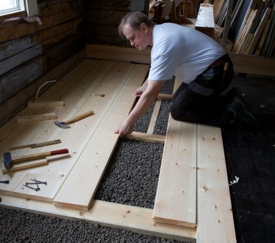 Når eg legg borda så kappar eg rein den enden som ligg inn mot veggen. Så legg eg bordet inntil bordet det skal drivast i hop med. Eg legg det parallelt og riktig i lengderetning. Foto: Roald Renmælmo