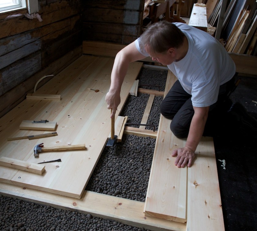 Det er vanleg å drive borda saman med kilar. Her har eg hogd til ein kile som har pløying i kanten og som passar i bordet. Eg brukar ein haldhake slått ned i tilfararen som mothald når eg slår på kilen. Foto: Roald Renmælmo