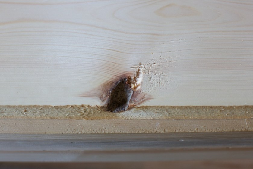 Furukvisten som er levande sit fast i veden. Den kan vere ekkel å høvle men kan gi eit bra resultat. Kvist som har vore død lenge medan furua har vokse gir kvist slik som dette. Det kallast svartkvist. Svartkvisten kan vere delvis fast, i alle fall i ei side av bordet. Her har kvisten ramla ut under høvling. Her kan eg høvle ned kanten ekstra og høvle fjør på bordet og såleis fjerne det meste av holet etter kvisten. Foto: Roald Renmælmo