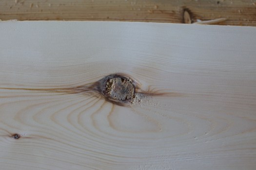 Svartkvist som ikkje ligg i kanten av bordet. Her blir det ikkje problem med pløyinga. Om kvisten sit fast kan bordet nyttast. Denne kvisten er laus. Saman med tre andre tilsvarande kvistar var denne med å sørgje for at eg kasserte bordet til golvbord. Foto: Roald Renmælmo