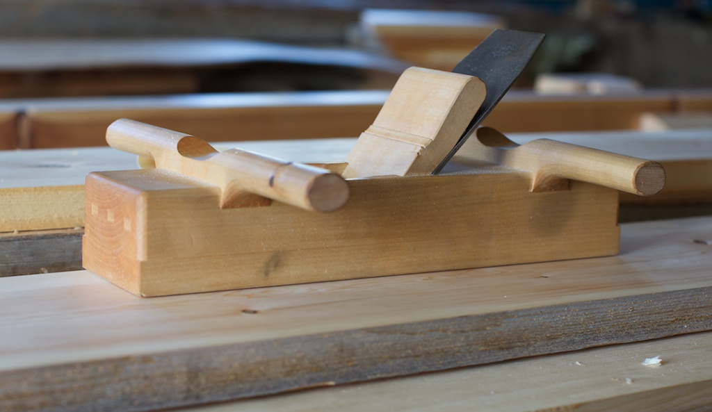 Eg høvlar over til slutt med slettoksen. På siste høveltaka høvlar eg heile flata på bordet med slettoksen. Merk at dette må gjerast før pløying av bordet. Foto: Roald Renmælmo