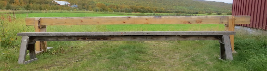 På garden i Sirma kom Arne over denne langbenken som er enkelt laga men ser ut til å fungere veldig bra. I standen for å stivast av med sargar på sidene eller ved å ha ein tjukk planke i setet så har ein lagt ein smalare planke på høgkant under setet. Slik kan ein byggje ein smekrare benk. Benken er 56 cm høg og 3,64 cm lang. Foto: Arne Graven