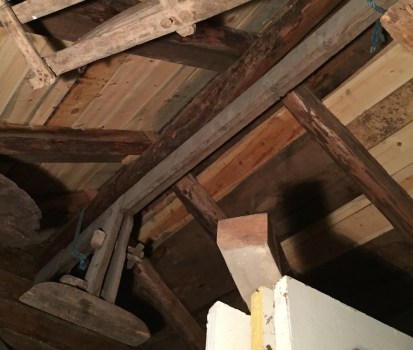 Under taket i lagerbygget som husa skottbenken heng det nok ein skottbenk. Denne vart ikkje tatt ut og fotografert i denne omgangen. Foto: Roald Renmælmo