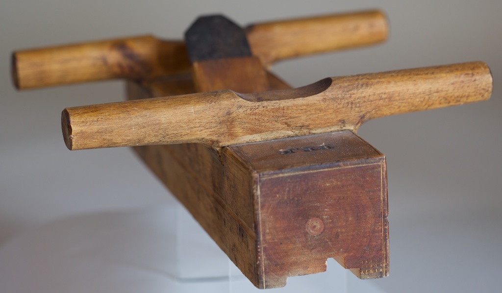 Golvploghøvelen frå førre bilete sett framafrå. Høvelen har ei heimesmidd tann som er 1 ¾» brei med ei spalte på ⅜» som er ⅜» frå kanten som ligg mot venstre land. Foto: Roald Renmælmo