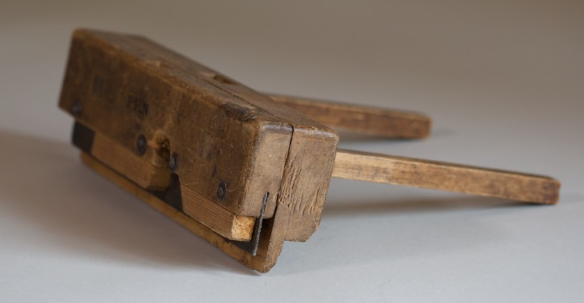 Ploghøvel med justerbart land. Høvelstokken er 11″ lang og har skøyte av jarn. I dag er det ikkje høveltann på plass men den har nok vore ganske smal slik at vi snakkar om ein splitthøvel. I dag er det spikra på ei list som djupnestopp men den har vore utan slikt. Skøyta er omlag 1″ høg. Pinnane er omlag 8″ lange, noko som er ganske vanleg på slike høvlar. Høvelen er merka PP.N. Senga til høvelstålet ligg på ca 45 grader. Foto: Roald Renmælmo