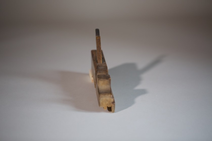 Nothøvelen frå førre bilete sett framafrå. Stålet er 9 mm bredt og høvlar nota 9 mm frå kanten. Nota er ca 8 mm djup. Senga for høvelstålet er ca 47 grader. Foto: Roald Renmælmo