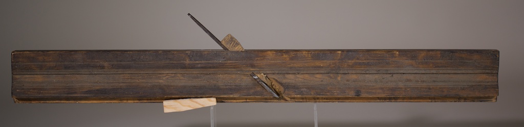 Ein fletthøvel til som er noko mindre enn den førre. Denne har stokk som er 21 ½» lang. Stokken er laga av noko anna enn bjørk men eg er usikker på treslaget. Det kan sjå ut som bartre men verkar tyngre enn gran og furu. Stokken er merka med PP.N. Høveltanna høvlar ⅝» bredt. Foto: Roald Renmælmo