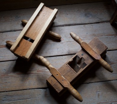 To flotte skottoksar i samlinga av verktøy på museet. Begge har meiar som er festa på sida. Den eine har forsterka sålen med eit stykke eik for å redusere slitasjen. Foto: Roald Renmælmo