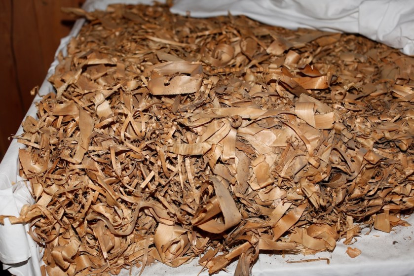 Det er ulike typar høvelspon som er brukt. Her kan ein sjå spon både etter gropoksen og slettoksen, tjukke og tynne spon. Her er også spon etter skottokse og etter pløying av golvbord med ploghøvlar. Tjukna på spona er eit resultat av kor grovt snikkaren har justert tanna på høvelen. Her kan vi få inntrykk av korleis arbeidet med høvlinga har vore. Kor tungt har det vore å dra høvelen? Kor mange drag måtte snikkaren høvle for å pløye borda. Foto: Roald Renmælmo