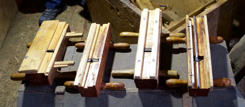 Oddbjørn har tatt vare på verktøyet som var på garden. Her er, frå venstre, ein stillbar brei falshøvel, ein fjørhøvel for skottbenk, ein skottokse og ein nothøvel for skottbenk. Både verktøyet og skottbenken stod i ei snikkarstue på garden. Foto: Roald Renmælmo
