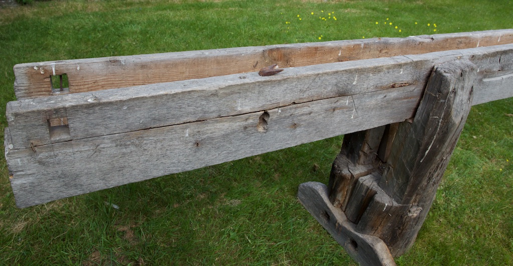 I begge endane av langborda var det tappa gjennom eit firkanta hol der det såg ut til å ha stått ein styretapp. Truleg har dette vore for å motverke at borda skulle svikte under høvling. Foto: Roald Renmælmo