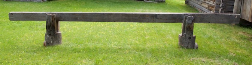 Skottbenken sett frå sida. Benken er 5,15 meter lang. Bukkane er plassert 1,05 og 1,08 meter inn frå endane. Inndelinga er då omlag som på mange av dei norske benkane. ⅕ av lengda av langbordet stikk ut på kvar side og ⅗ er mellom bukkane. Foto: Roald Renmælmo