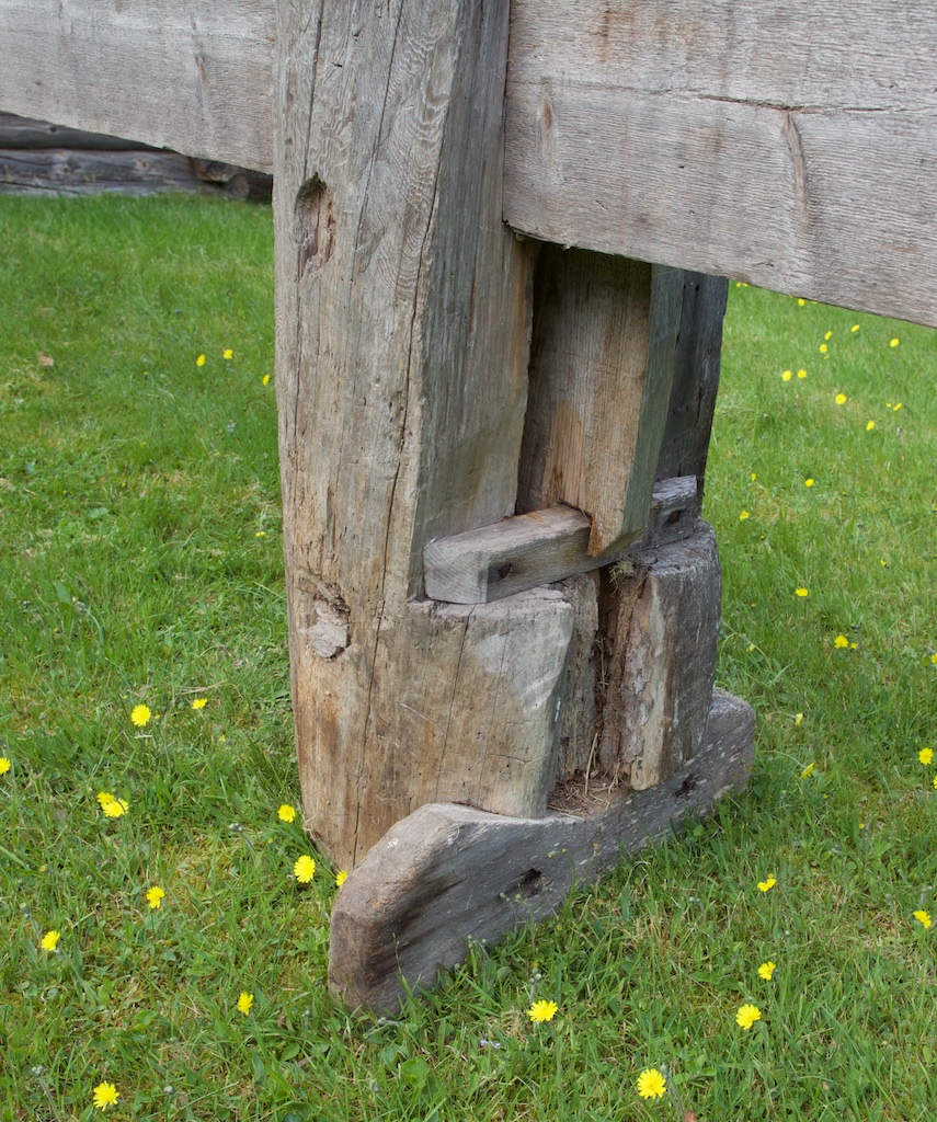 Kvar bukk består av ein kraftig rundstokk av furu som det er hogd ut for langborda i. For å gjere bukken stødigare er det felt inn ein bordbit som er spikra fast nederst. Foto: Roald Renmælmo