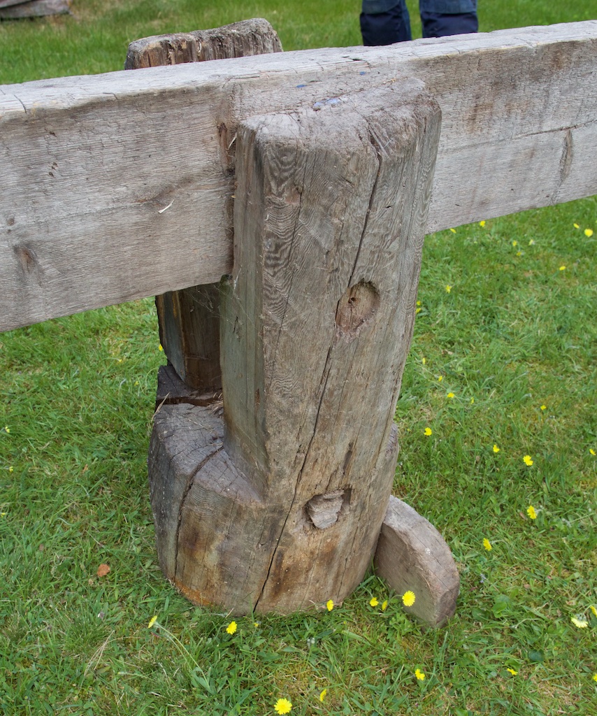 Dei to bukkane er utsett for utkløyving om ein spenner hardt til med kilen. For å unngå dette er det bora hol og slått inn ein gjennomgåande trenagl som er låst med kilar. Foto: Roald Renmælmo