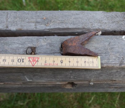 Haken er av ein type som ikkje er så vanleg men det er døme på slike i gamle høvelbenkar i Hedmark i Noreg. Nemninga jarnklo er då brukt om denne modellen. Det er også spor etter det som truleg har vore ein anna variant av hake til venstre. Foto: Roald Renmælmo