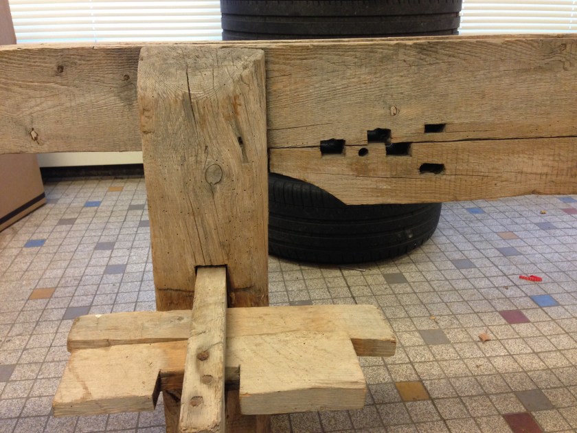 Skotbenken har kilestramming for langborda. I tillegg er det tappa inn hol i langborda for tappar (klosser) som borda kvilte på for å støtte dei opp i riktig høgde for skyting. Slik kunne dei få høvla paralelle bord. Foto: Øyvind Skarstein