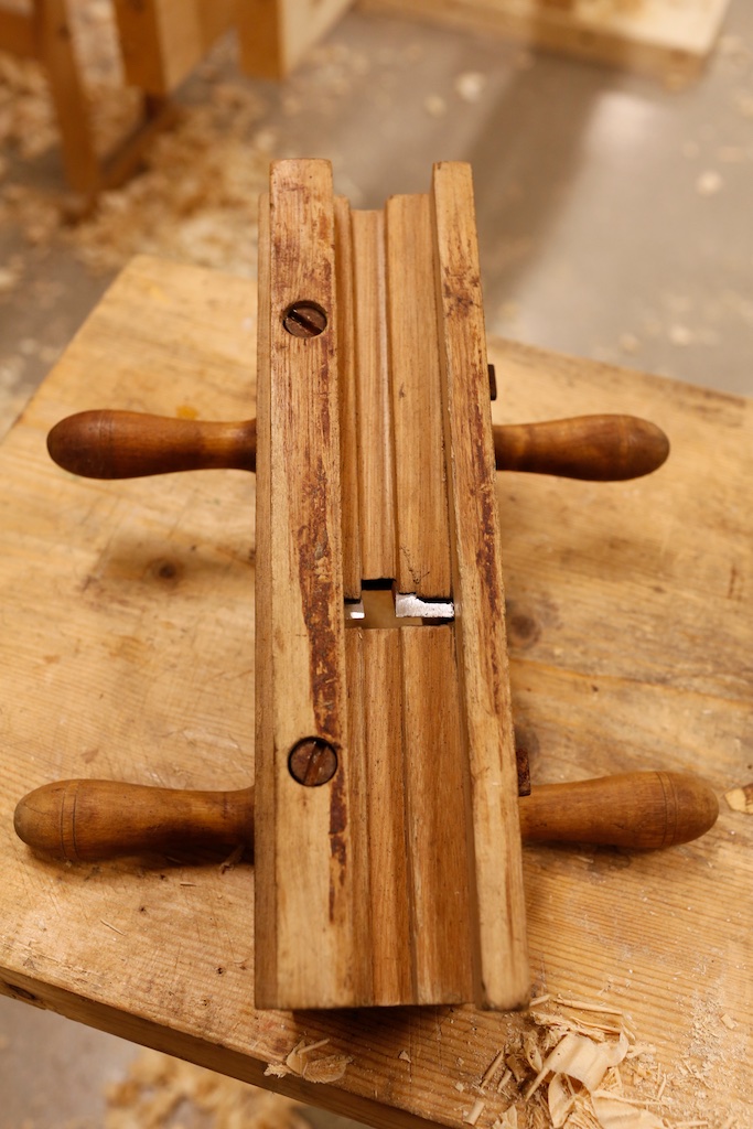 Golvplogen sett frå undersida. Her ser ein skruvane som går gjennom landet. Med dette kan ein justere avstanden frå rettsida av bordet og til fjøra. Foto: Roald Renmælmo