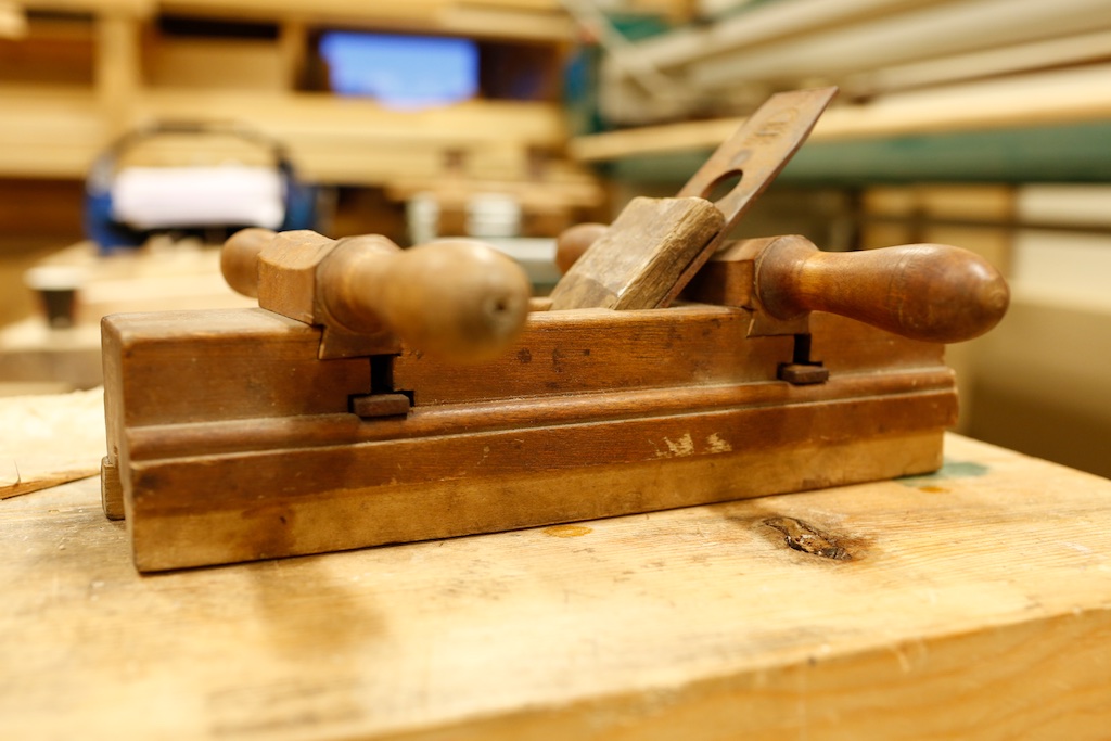 Golvplogen har to flatjarn som er felt gjennom høvelstokken under handtaka. I eine sida av desse er det bora eit hol som er gjenga opp. Desse høver for skruven som kjem opp frå undersida av det flyttbare landet. Foto: Roald Renmælmo