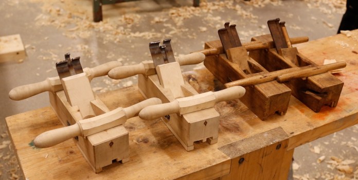 Her er dei to nye golvplogane som Jon Dahlmo har snikra seg. Han har sjølv smidd ståla og laga beslaga med settskruvar som held ståla på plass. Høvlane og ståla er laga etter dei originale høvlane til høgre på biletet. Foto: Roald Renmælmo