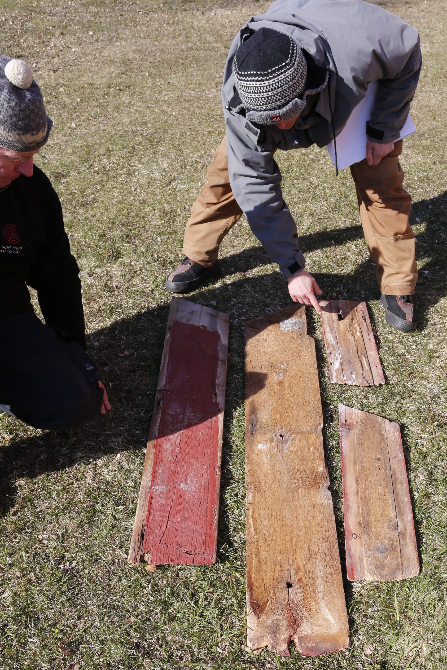 Etter litt leiting i kjellar og på stabburet fann vi nokre av dei originale kledningsborda som vart bytt ut i 2008. Her er museumshandverkar Thor Larssen (t.v.) og restaureringshandverkar Siv Holmin som undersøkjer nokre av dei originale borda. Foto: Roald Renmælmo