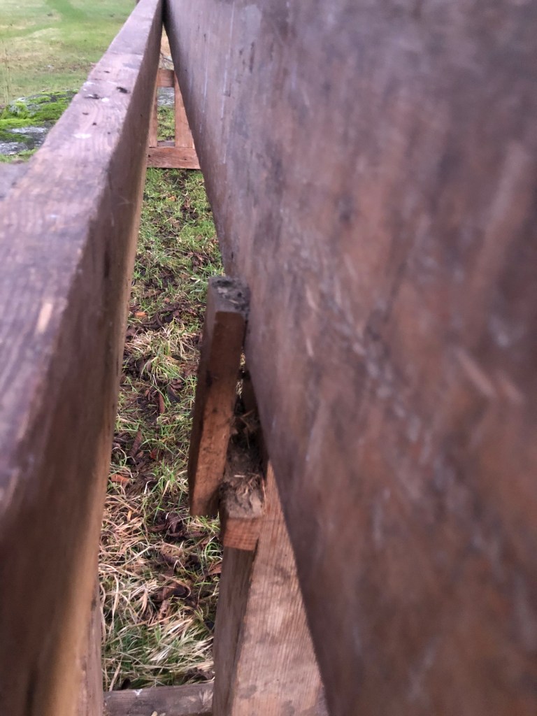 Det er spikra ein kloss mellom langborda, truleg for å unngå at borda som skal høvlast ramlar ned i mellom føtene. Det kan vere at denne klossen har vore brukt som djupnestopp for å sikre ei fast breidde på borda som vart høvla?
