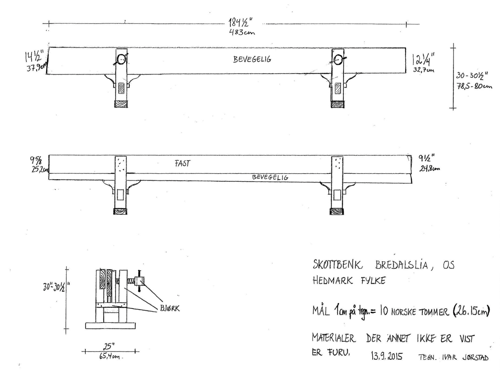 Målsett skisse av skottbenken fra Bredalslia. Skisse: Ivar Jørstad