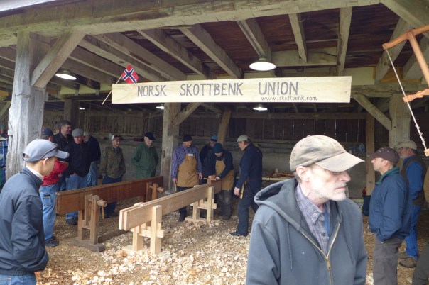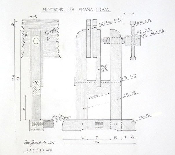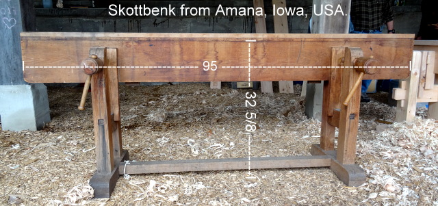 In 2017 some members of Norsk Skottbenk Union made a trip to Minesota, Wisconsin and Iowa in USA to do some research on traditional workbenches for jointing long boards in theese areas, and to meet fellow woodworkers. We had some knowledge about the Aslak Olsen Lie house project in Wisconsin and made a visit to the building site at Folklore Village. Luckily the carpenter Nels Diller where working on the site the day we came and he informed us about the work and showed us the original materials from the house built by Aslak Olsen Lie in 1848-49. We studied the floor boards from the original house and discussed if the boards had been made on a skottbenk. Inspired by this Nels have now made his own skottbenk based on the original old skottbenk we found in Amana, Iowa on our trip in 2017.