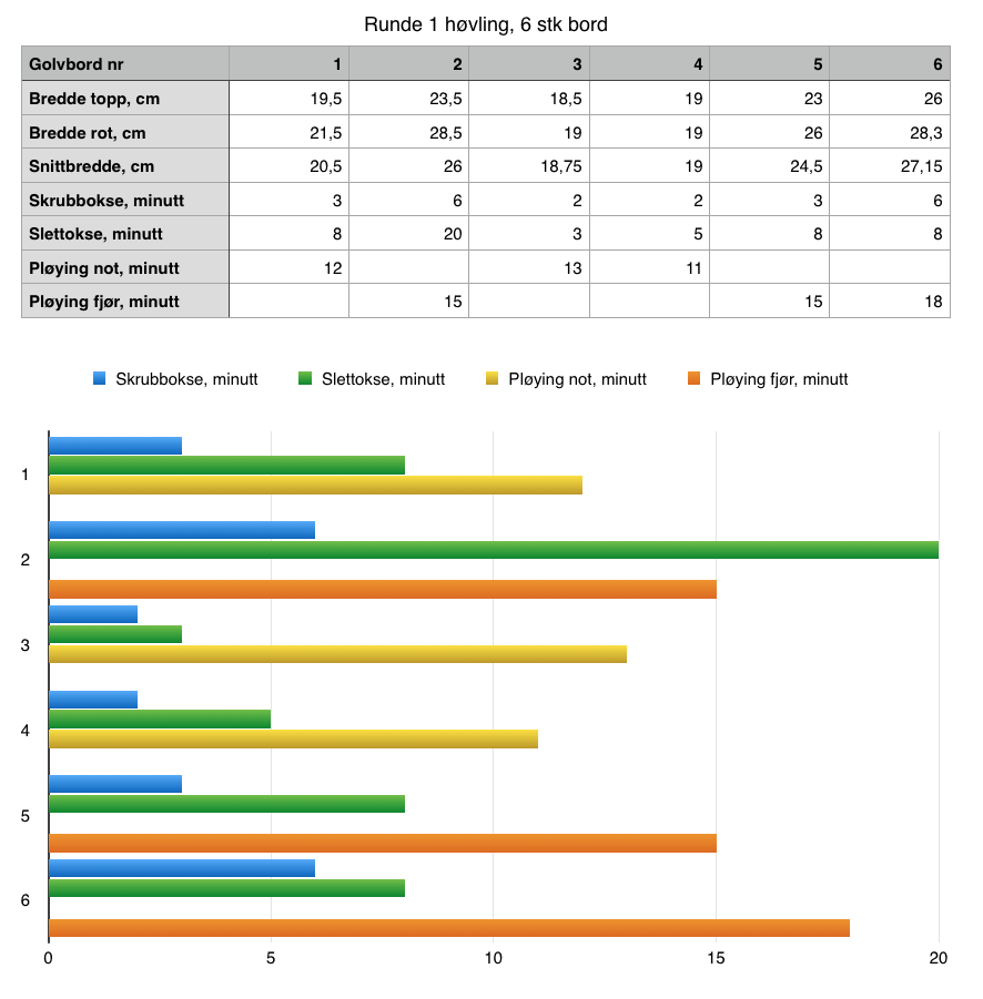 Summert tidsbruk for kvart bord er slik, bord 1 – 23 minutt, bord 2 – 41 minutt, bord 3 – 18 minutt, bord 4 – 18 minutt, bord 5 – 26 minutt og bord 6- 32 minutt. Total arbeidstid for høvlinga er 2 timar og 38 minutt. Ein skulle tru bord 6 som det breiaste ville krevje mest arbeid med høvlinga, men i staden var det bord 2 som utmerka seg i så måte. Her var det høvling med slettoksen som gjorde utslaget i arbeidstid. Dette var på grunn av at bordet både var vindt og krumma under tørkinga. Om borda er nokolunde flate før ein tar til med høvlinga så sparar ein veldig mykje tid. Kvaliteten på materialen er altså avgjerande for tidsbruken. For alle 6 borda er summert tidsbruk for skrubboksehøvling 22 minutt, for slettoksehøvling 52 minutt, totalt 1 time og 14 minutt på sletthøvlinga. For tre av borda er summert tidsbruk for nothøvling 36 minutt og for fjørhøvling 48 minutt, totalt 1 time og 24 minutt på pløyinga. I effektiv produksjonstid på høvlinga har eg brukt om lag 45 min/pr. m2 golvbord.