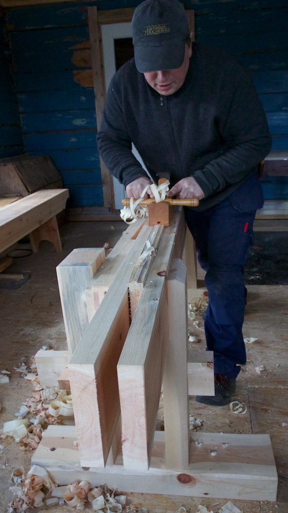 Høvling av golvbord på skottbenk. Foto: Roald Renmælmo