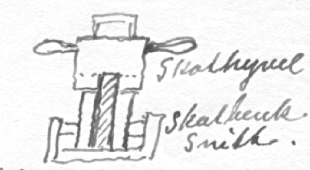 Skisse av skøttlangbenk av Andreas MørchDen typen benk som Andreas har forklart og teikna kan minne om rettbenken frå Stigums magasin på Norsk Folkemuseum som Terje Planke har presentert for oss tidlegare. Forklaringa og skissene til Andreas er svært detaljerte og får fram på ein god måte kva dei enkelte delane heiter og korleis benken verkar. Andreas skriv også om gølvhaka i svaret sitt. Han skriv følgjande:
