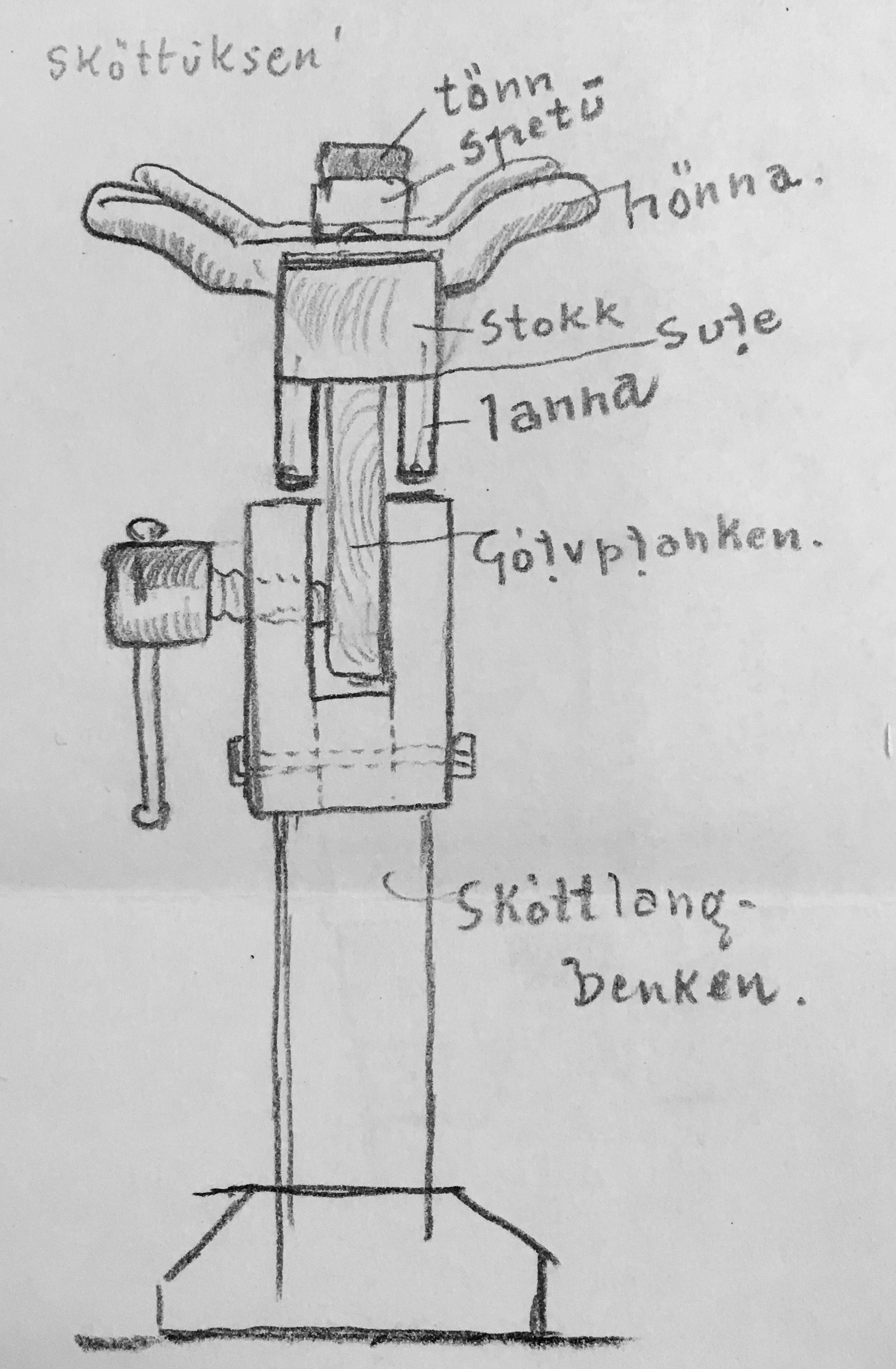 Sidan skottbenken ikkje er ein del av pensum i formalisert fagutdanning i snikkarfaget og ikkje med i faglitteraturen i faget er det ikkje så lett å finne felles, eller gode, nemningar på benken, delar av benken og arbeidsmåten. Vi har nokre spreidde kjelder som er med i oversikta over litteratur om skottbenk i menyen over. Vi har også presentert nokre bloggpostar om både nemningar og om ulike skriftlege kjelder. Med søkefunksjonen i bloggen kan ein enkelt spore opp alt som er skrive. Det er eit materiale som har vore nemnd ved nokre høve men som ikkje er skikkelig forklart; svara på spørjelista om snikkarhandverket i Ord og Sed i Norsk Folkeminnesamling. Spørjelista vart sendt ut til snikkarar i heile Noreg i 1934. Det kom inn 168 svar, nokre er særs omfattande og detaljerte og andre har lite informasjon som er nyttig for oss. Eg har skrive ein artikkel med utgangspunkt i noko av dette materialet, Kjellingfot og ronghake – nemningar i snikkarhandverket omsett til handverkspraksis. Der skriv eg meir om bakgrunnen for spørjelista. Eg har også posta på høvelbenkbloggen om dette. Artikelen har utgangspunkt i svara på spørsmålet om høvelbenken. Spørsmålet var formulert slik: