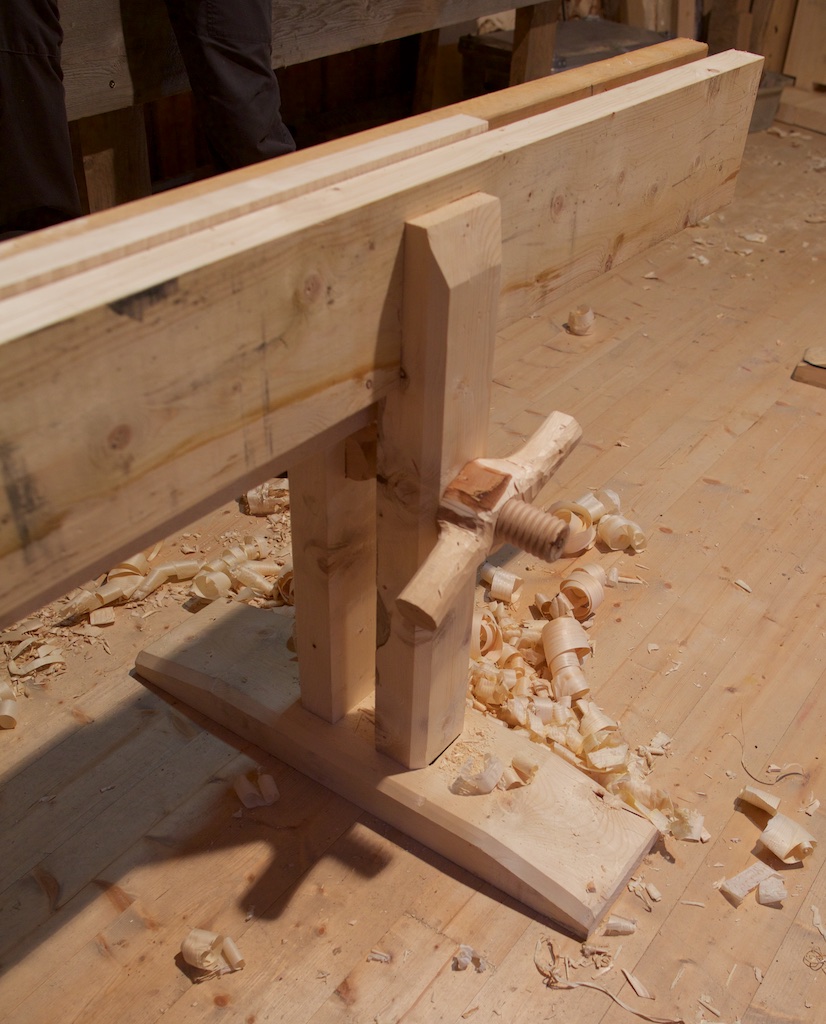 Cato og eg bestemte oss for å laga benkane våre ut i frå den gamle frå Gurograv på Nes, blanda med museet sin. Me brukte restmaterialar eg hadde til overs frå då me bygde det stora redskapshuset me har som kurslokale. Dette er heimeskore på ei lita bandsag eg har. 3×5 tomms av lerk, furu og gran. Langborda måtte me skjæra te dette prosjektet. Cato hadde ikkje prøvt å saga material før. Nå fekk han saga sine egne langbord til strykebenken sin. Då me arbeidde med desse benkane kom der som vanleg andre interessert og ville vera med. Det blei nokre kjekke stunder med snekring av strykebenker. Under labankdør-kurset var dei uunnværlige. På det mesta var alle fira benkene i bruk. Både dei gamle og dei nye.